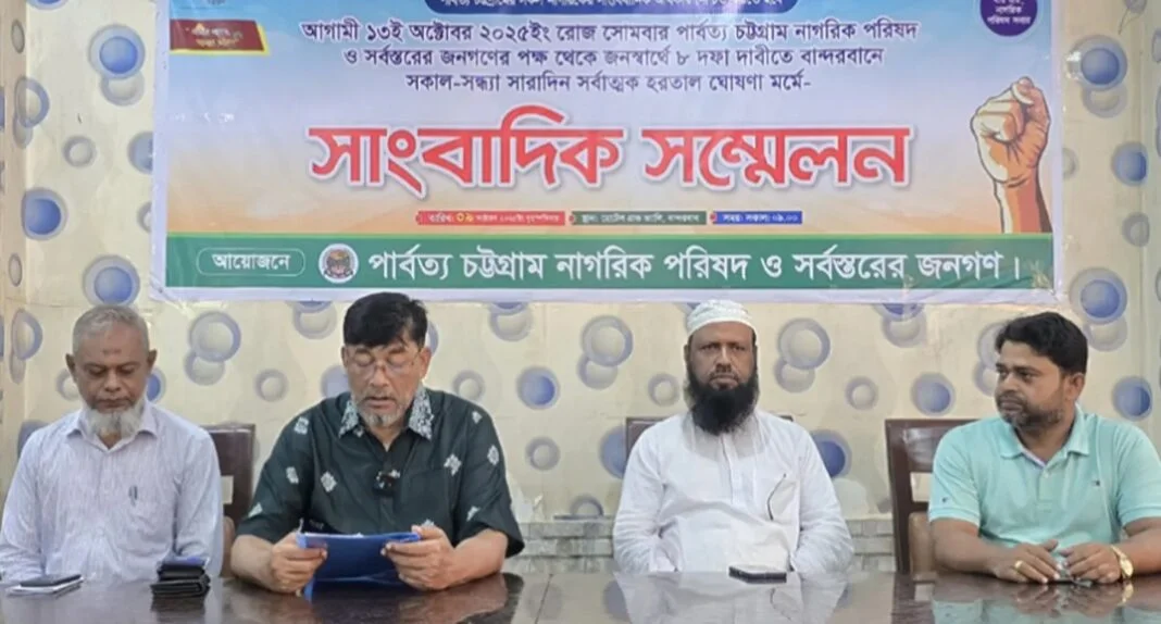 ৮ দফা দাবিতে আগামী ১৩ অক্টোবর (সোমবার) বান্দরবানে সকাল-সন্ধ্যা সর্বাত্মক হরতালের ডাক দিয়েছে পার্বত্য চট্টগ্রাম নাগরিক পরিষদ।